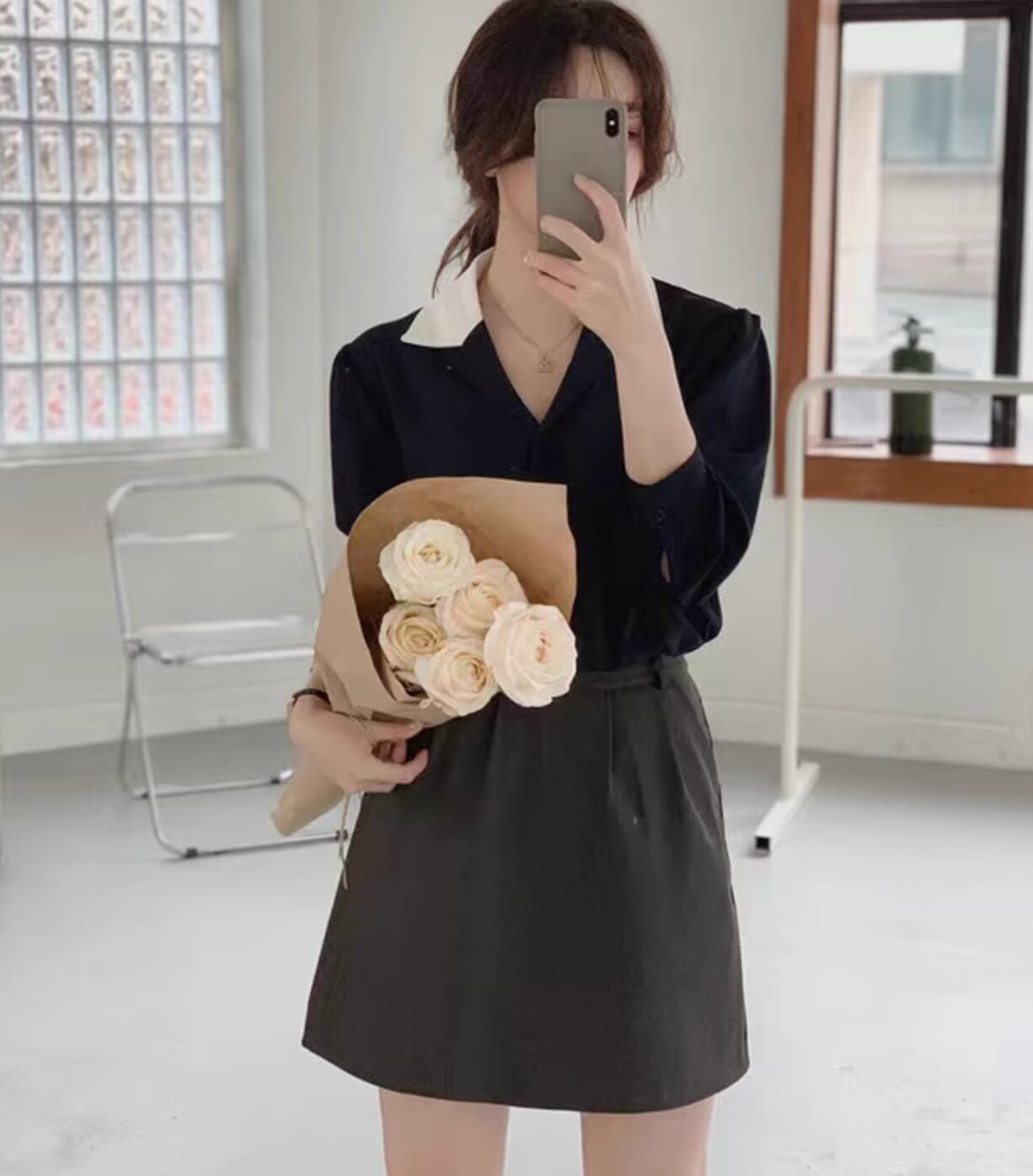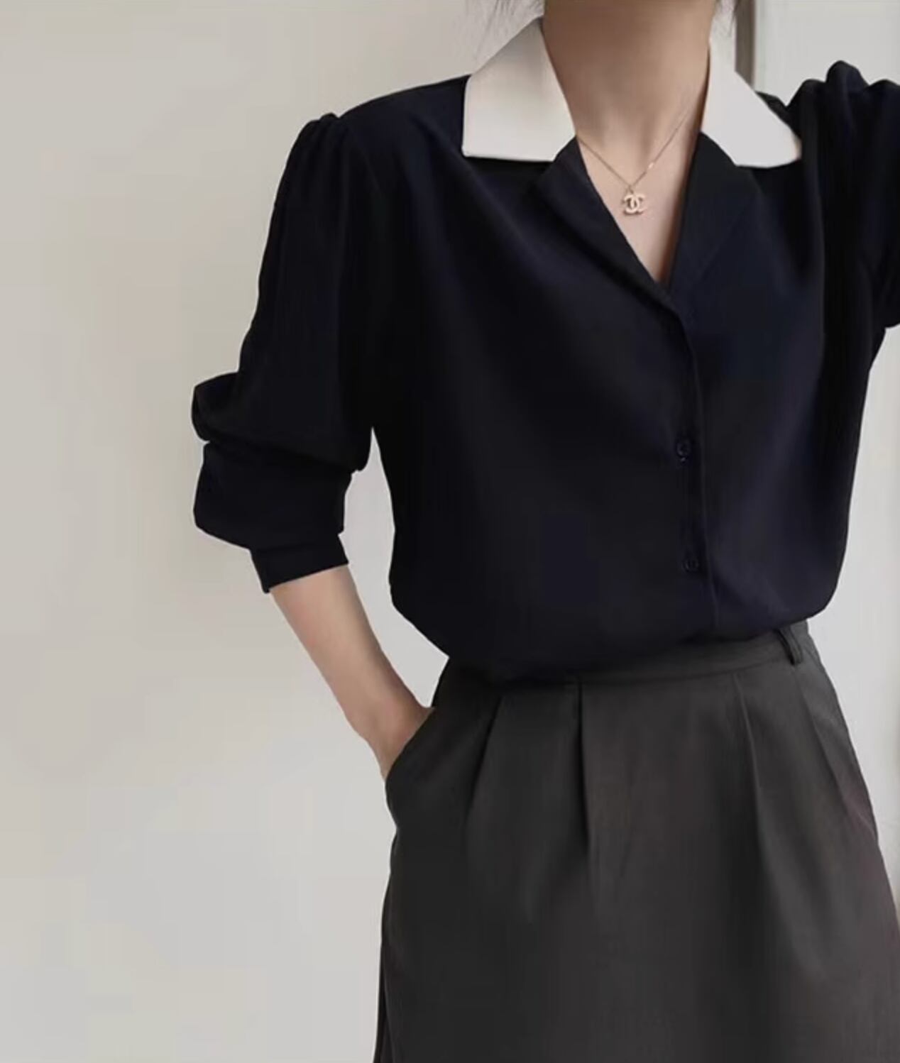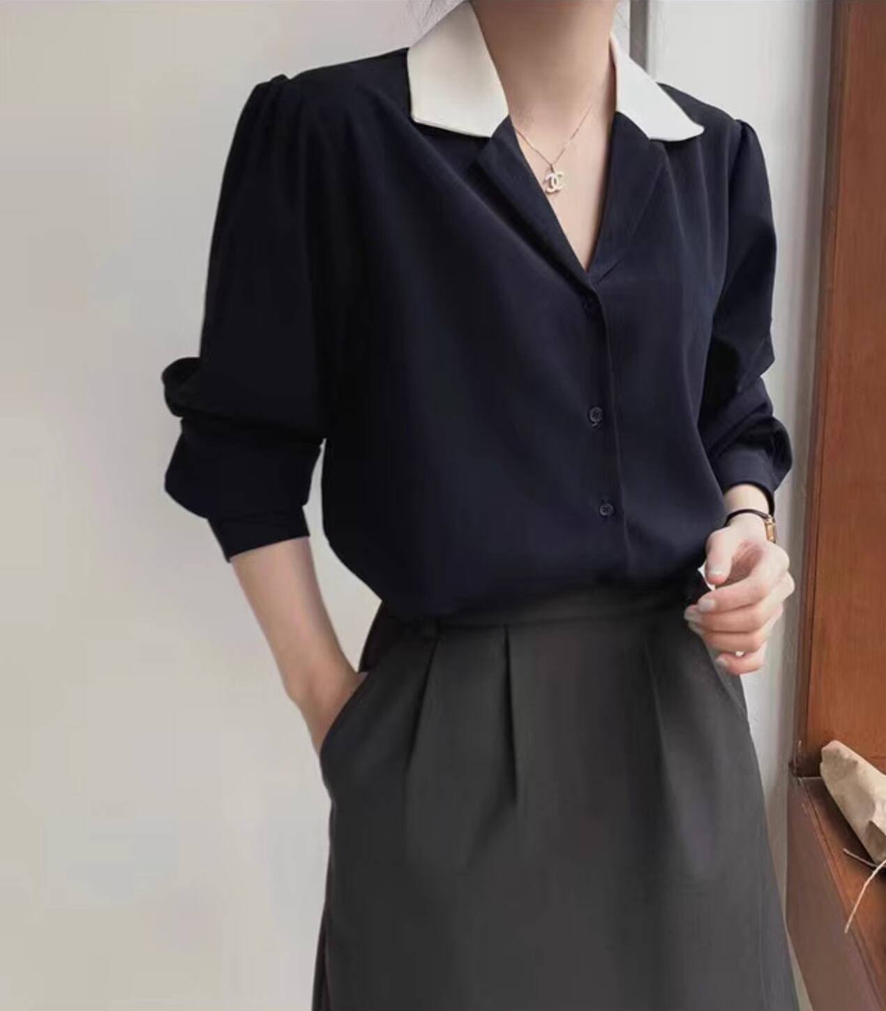 商品名:韓国シック スーツ襟 シフォンシャツ トップ